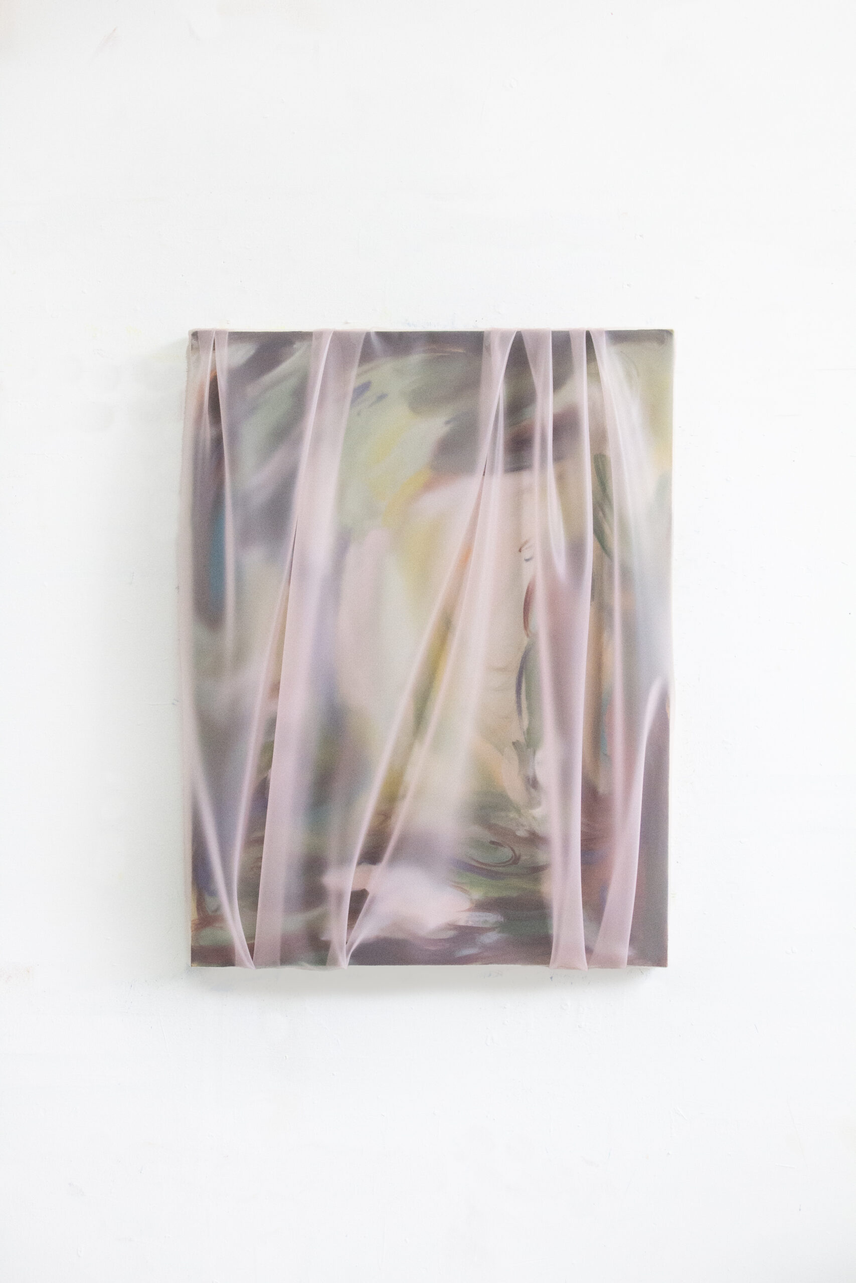 Expanding her painterly language, Steyaert introduces abstract gestural works influenced by Claude Monet and his en plein air practice, capturing fleeting moments of light and, atmosphere through fluid brushstrokes. Combining painting with carefully draped layers of matte silicone Steyaert creates a soft veil between the painted surface and the viewer, obscuring parts of the work whilst highlighting others. This mediation evokes a sense of shifting air and time, as if seen through a subtly toxic lens of silicone, inviting the viewer to become immersed, yet never fully oriented, much like wandering through a garden and becoming lost. The series Through the Ripples embodies this sensation of partial perception. The silicone layer suggests looking through water, movement i.e. folds revealing only fragments of what lies beneath, enough to intrigue but never to fully resolve.