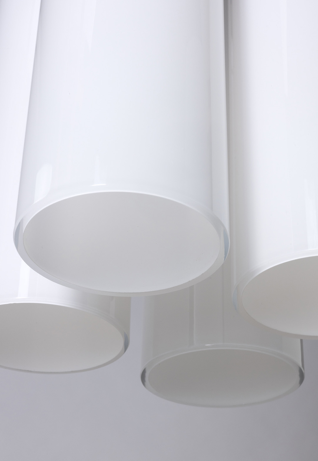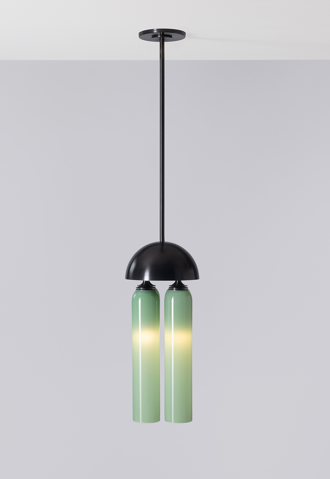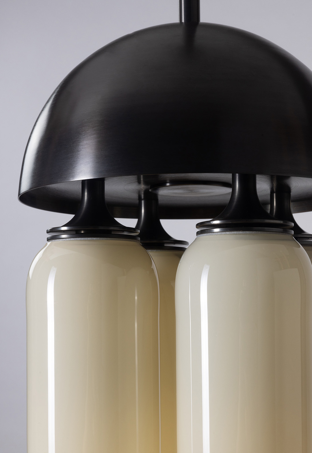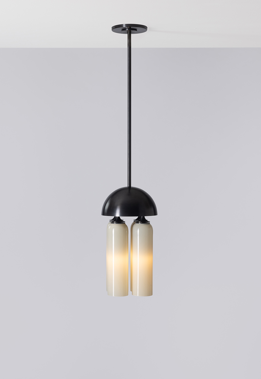 The Crown Pendant from the SkLO + AvroKO Collection nestles groups of lit, handblown glass cylindrical shapes beneath supporting brass domes. It arranges four lit opaque glass shapes beneath its dome. The tops of the glass shapes curve elegantly to share the geometry of the dome itself. The glass is available in two lengths and in multiple opaque glass colors and brass hardware finishes.