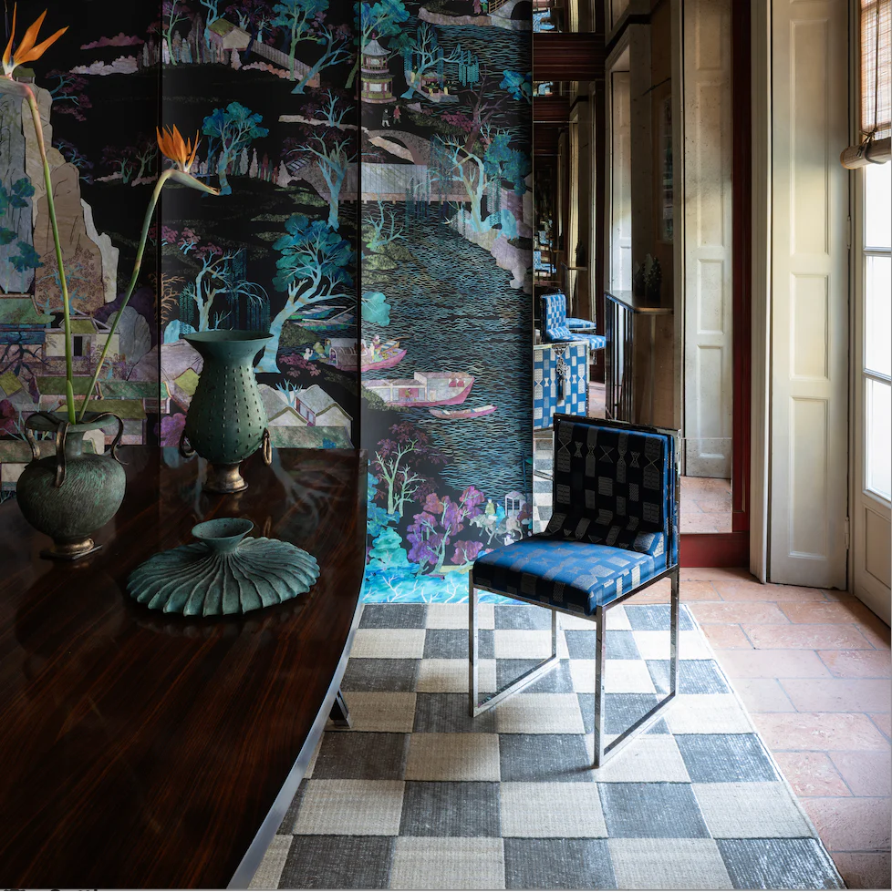 Damier is a rug that combines graphic rigor with material richness. Made with agave, wool, and stainless steel inserts, it plays with contrasts between matte and shiny, natural and sophisticated. A contemporary piece, rich in character and style.