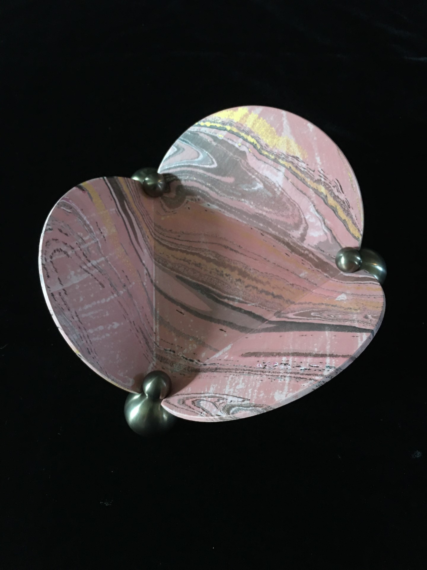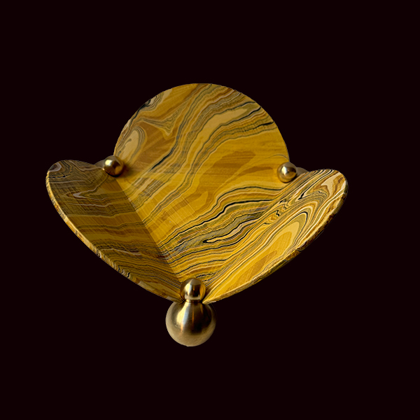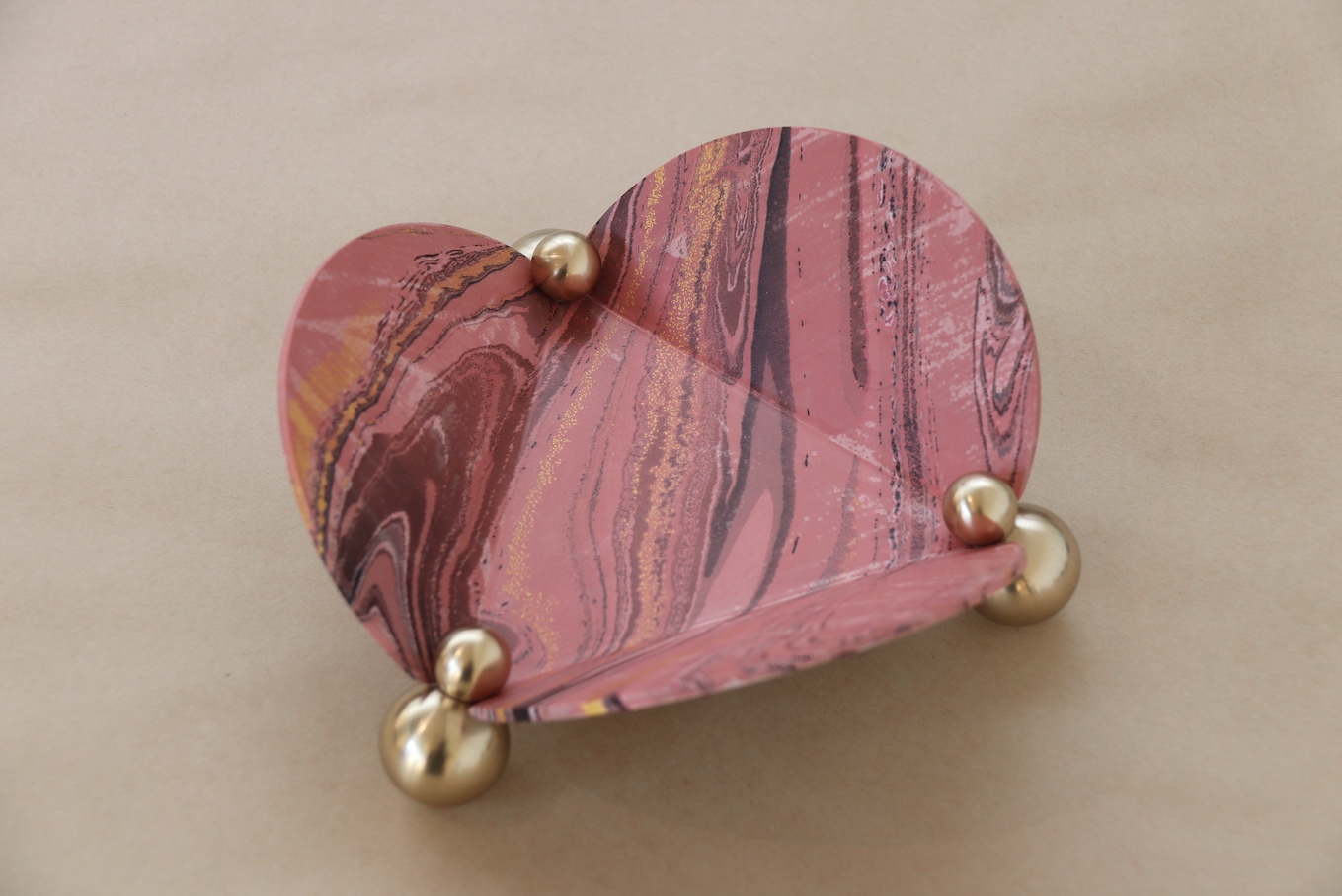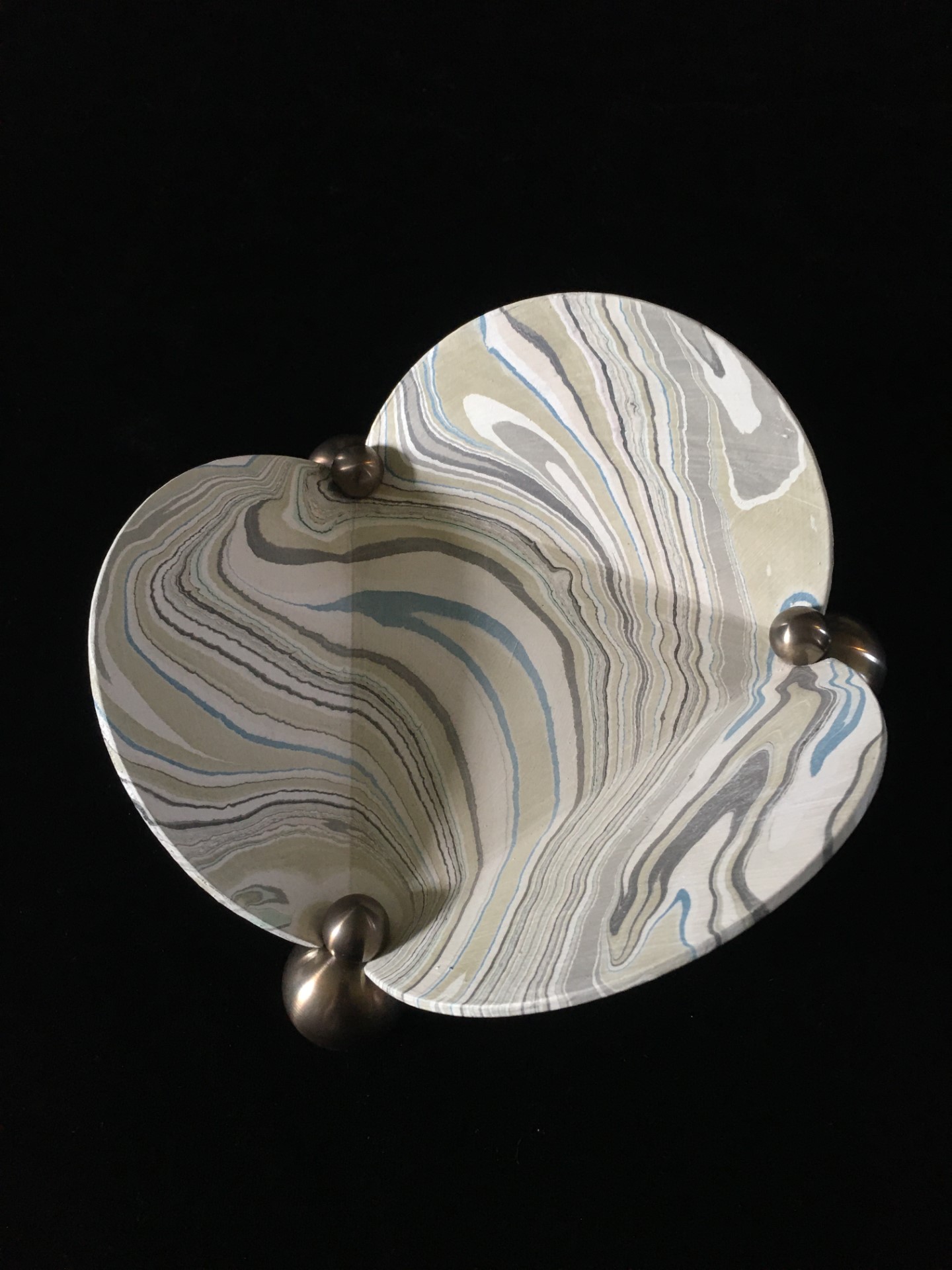 With their linear folds and petal-like curved edges, bowls and platters from Simon Leah offer sculpture and function in one. While the bodies are made of marbled aluminium, the finials and feet are rendered in brass. “These fall under the umbrella of ‘Ungapatchka,’” Leah explains, “my long-term project exploring the excessively ornate – with a leaning toward the vulgar!”