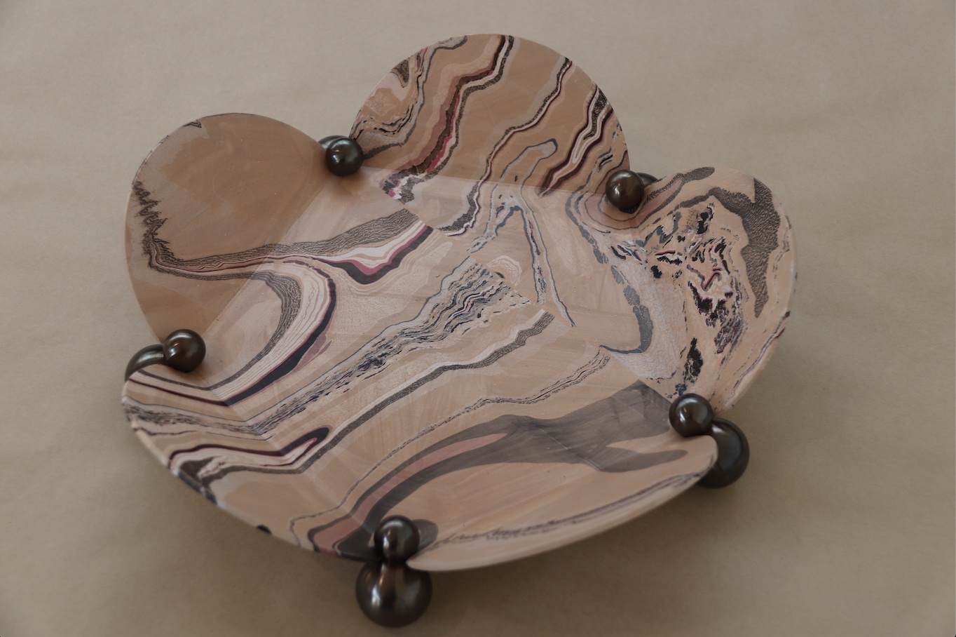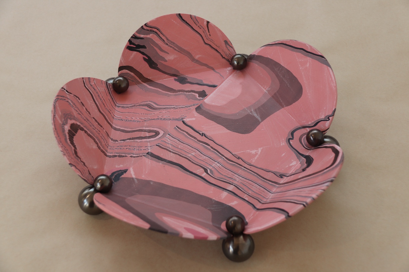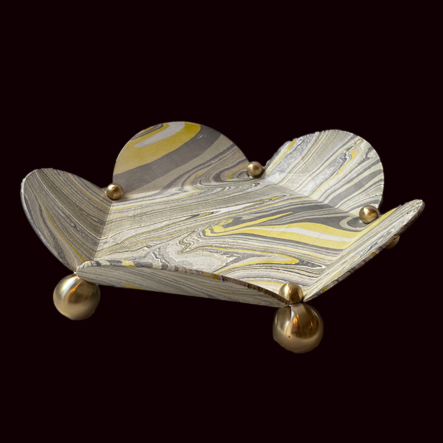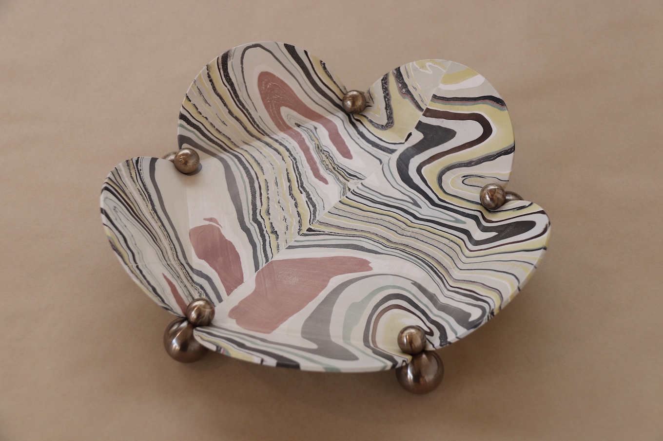 With their linear folds and petal-like curved edges, bowls and platters from Simon Leah offer sculpture and function in one. While the bodies are made of marbled aluminium, the finials and feet are rendered in brass. “These fall under the umbrella of ‘Ungapatchka,’” Leah explains, “my long-term project exploring the excessively ornate – with a leaning toward the vulgar!”