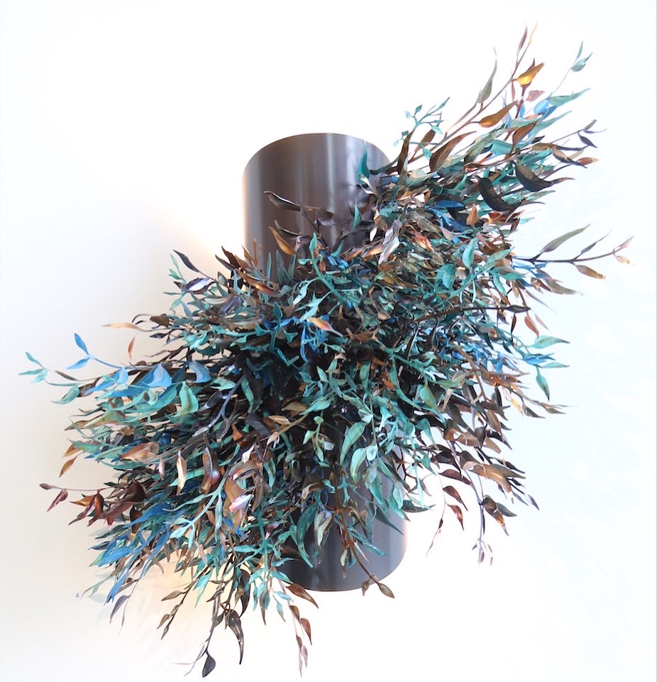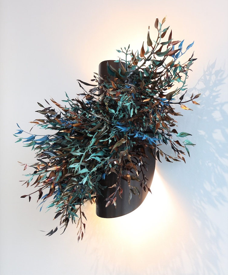 The Ungapatchka Epicormia wall sconce is inspired by the rapid, brightly coloured regrowth that shoots from the trunks of Eucalyptus trees after a wild fire. The first of the pair was made as a private commission in 2022 with the second, (it’s twin but in reverse with the foliage running top right to bottom left) made for exhibition, ‘Merrily, Merrily, Merrily, Merrily’ in Divisions Gallery, Australia, 2023.