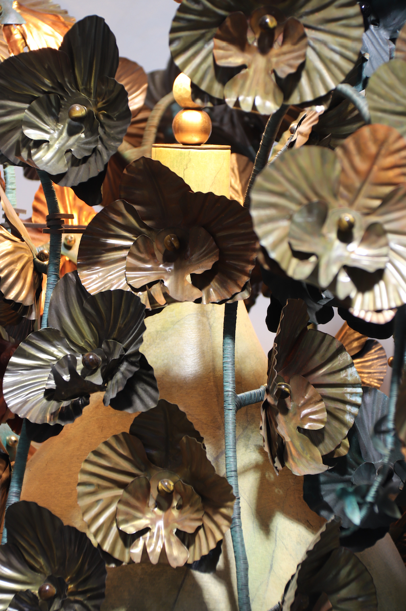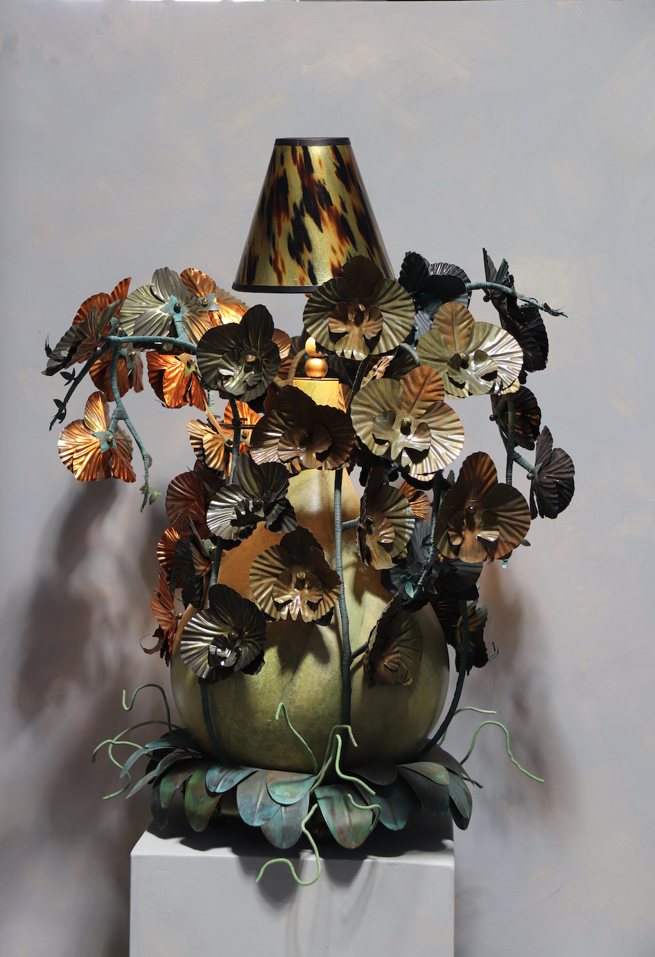 Inspired equally by Victorian hothouses and Grottos, the Ungapatchka Phalaenopsis lamps are an exercise in excess. Layered texture, hidden details, opulence and abundance. The turned American Oak bases are painted to resemble stone by renowned Australian decorative Artist, Kat Rhodes. The tie dyed shades by Australian lighting company Rakumba, and have been through many processes to achieve the desired sun bleached effect. The Copper and Brass blooms, a fantasy hybrid of a Phalaenopsis Orchids and a Bearded Iris are hand made and formed, using blackened, aged and flamed finishes. In their center, semi precious stones, Quartz Crystal and Tigers Eye. Hiding under the base are marbled bronze leaves and behind them, a dense, soft forest of artificial moss, and twisted, undulating Copper root forms. Brass lamp holders, woven fabric cable and plugs are UL listed.