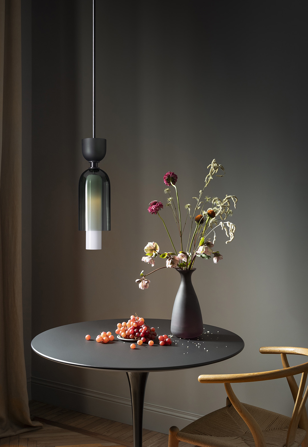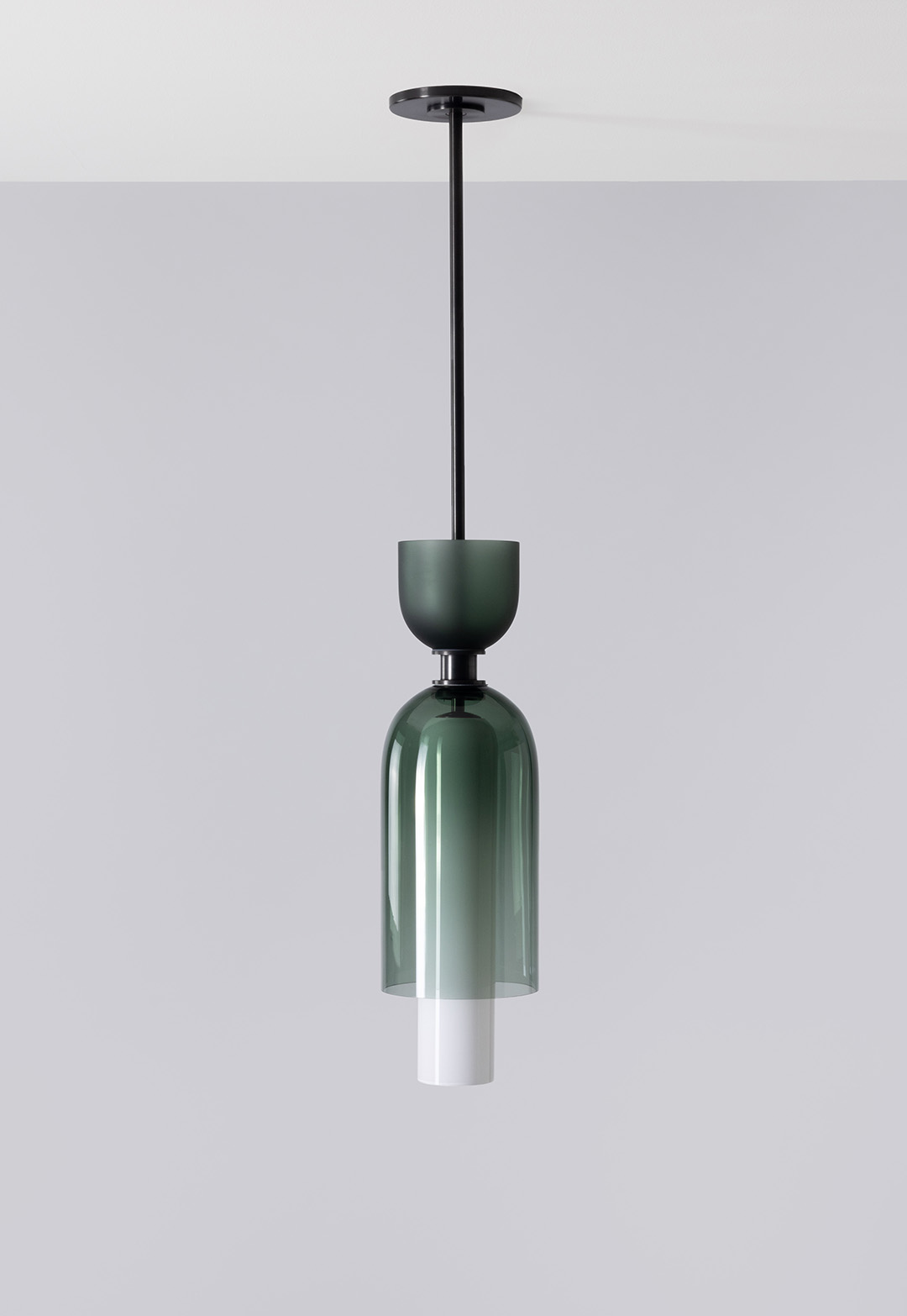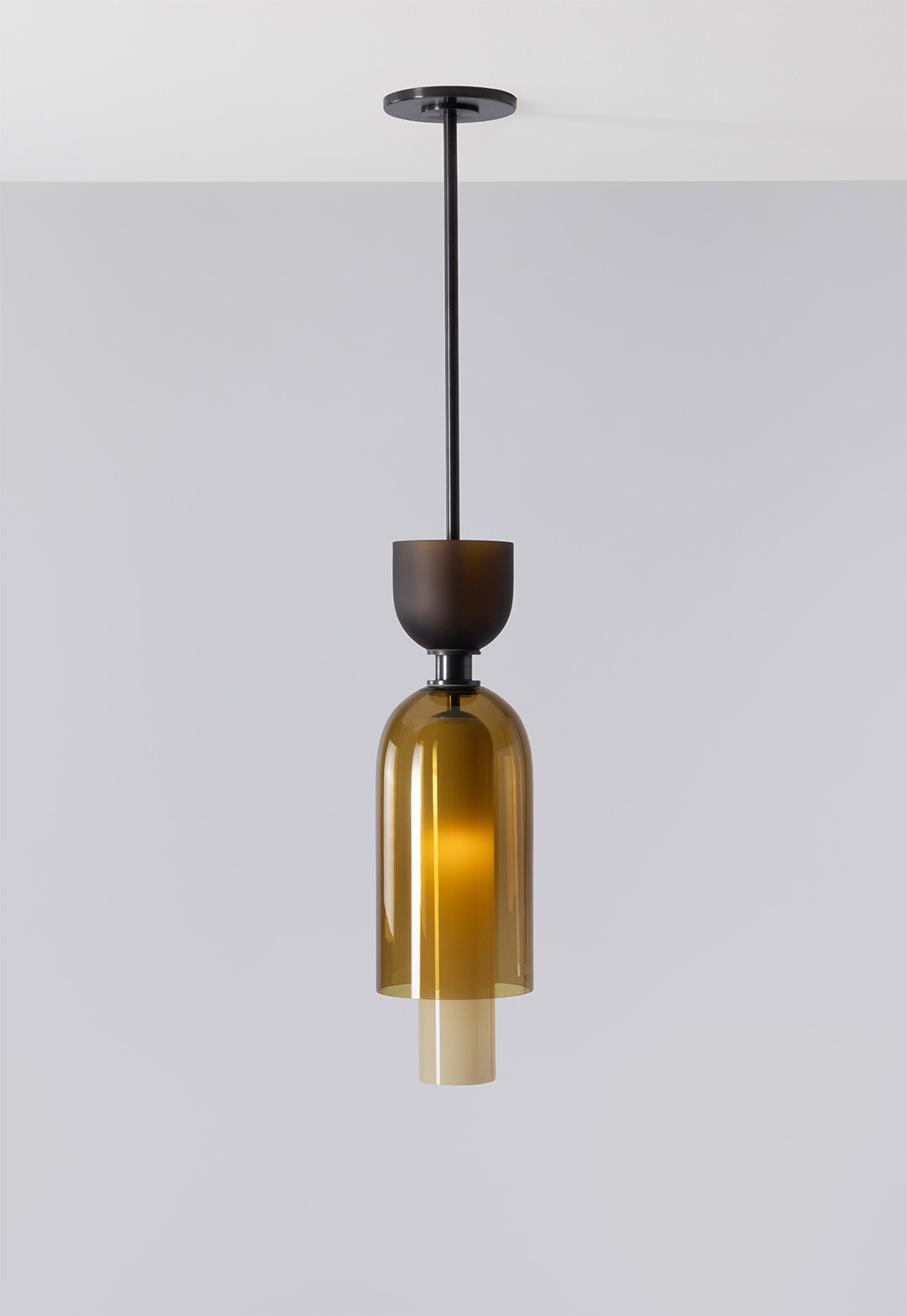 The Union Pendant from the SkLO + AvroKO Collection combines upward- and downward-oriented glass dome shapes of different proportions in carefully curated palettes that mix color, transparency, and texture. The Union Pendant is the largest of the series, composed of three different glass colors and textures. The lower part of the pendant houses its light source within a long, narrow, opaque glass dome, which is itself enclosed within a larger transparent glass dome. Above the detailed brass hardware transition sits a smaller, upward-facing dome of frosted glass. The color palettes are carefully curated to be both compelling and stately. Available in multiple glass color combinations, and brass hardware finishes.