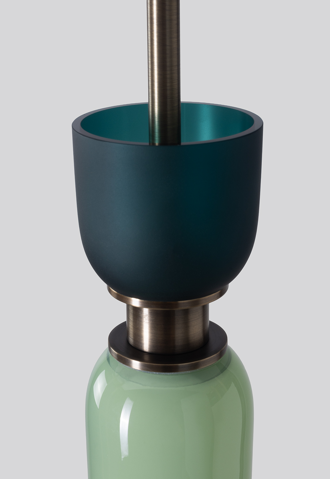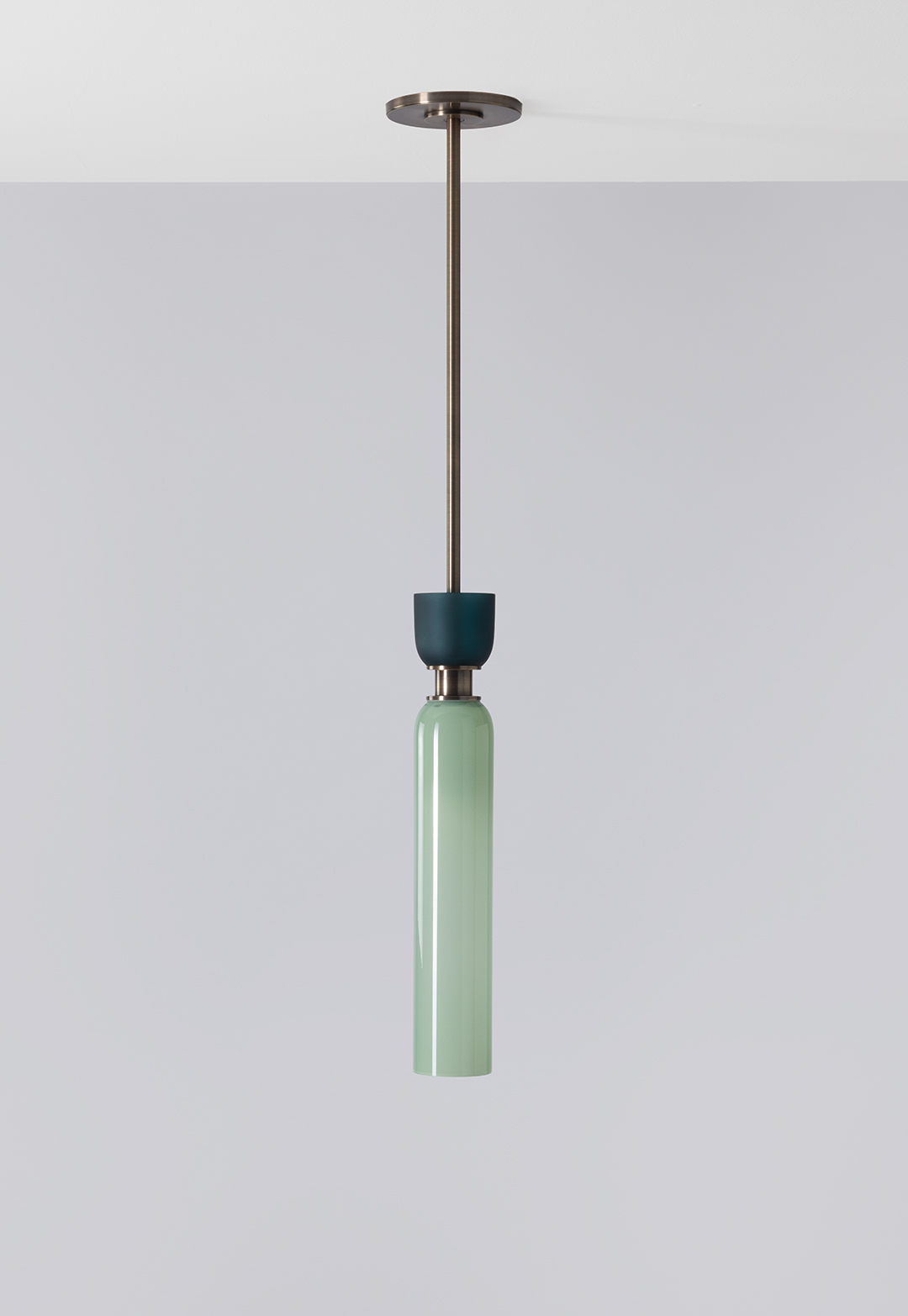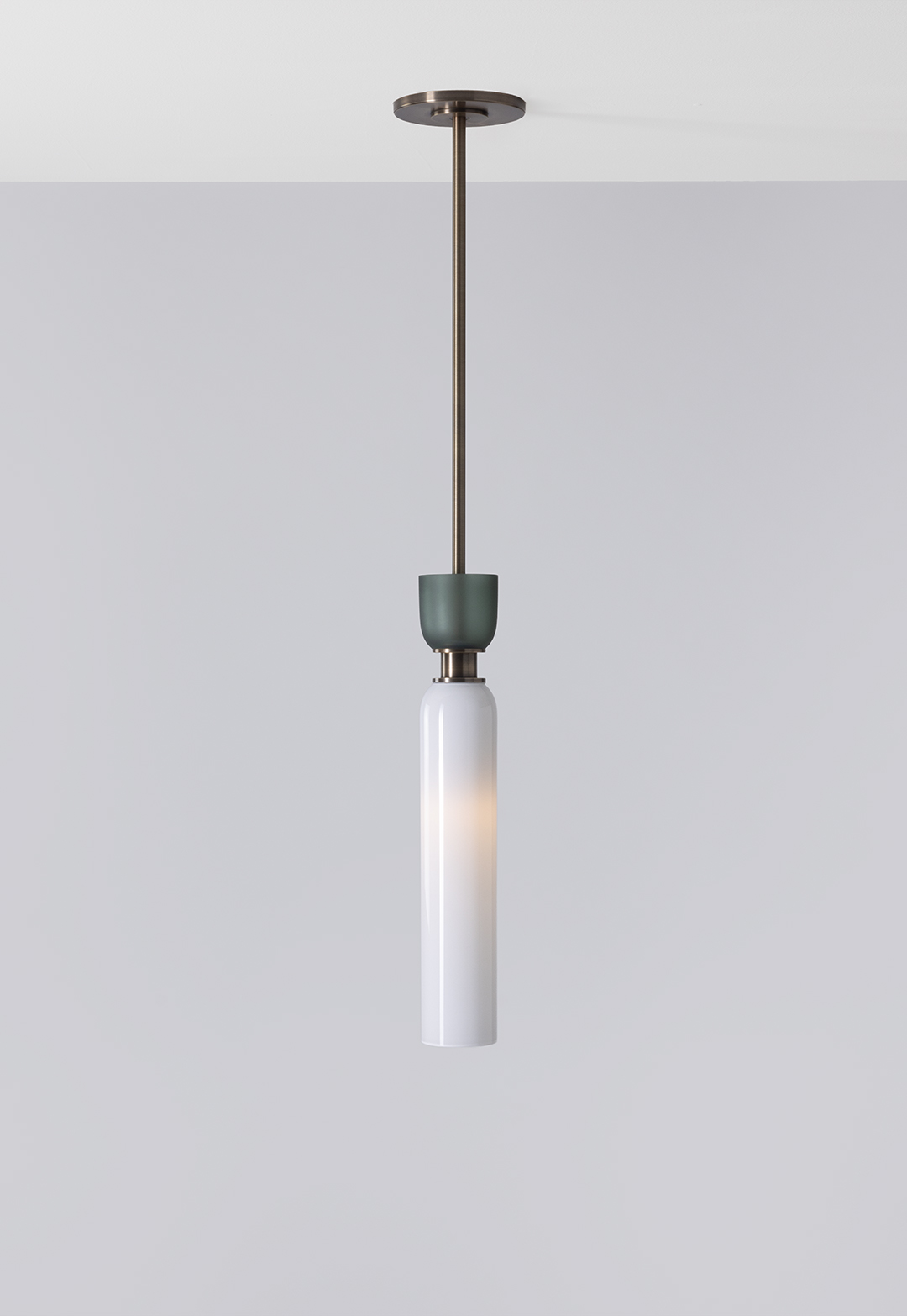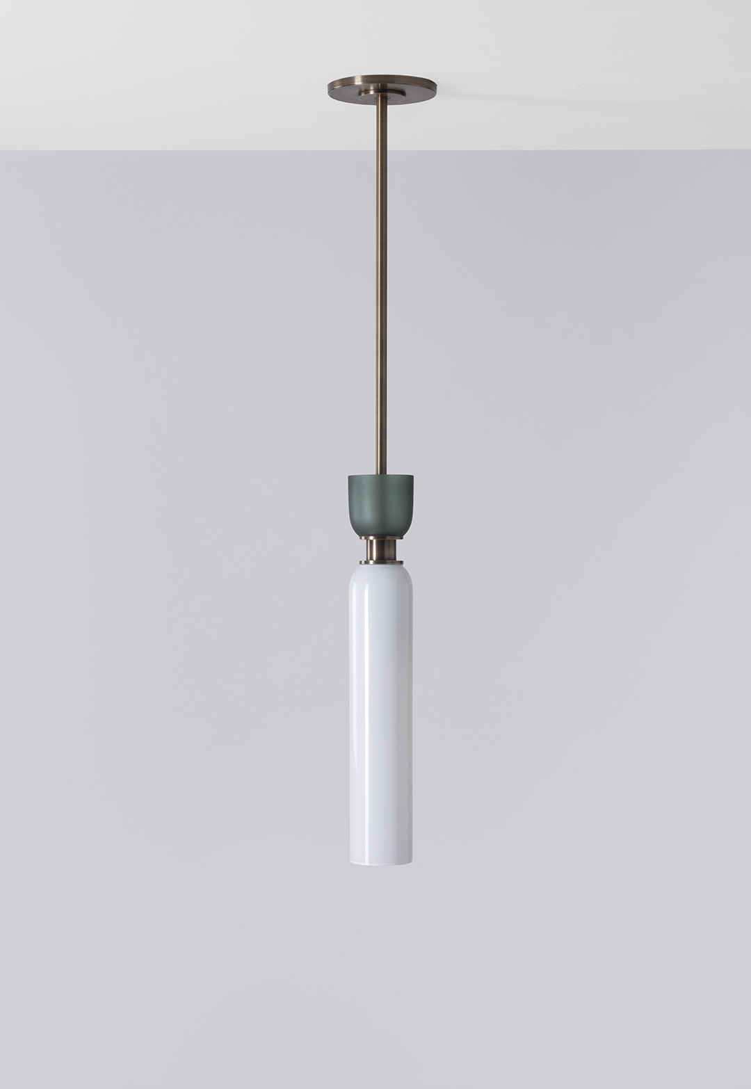 The Union Small Pendant from the SkLO + AvroKO Collection combines upward- and downward-oriented glass dome shapes of different proportions in carefully curated palettes that mix color, transparency, and texture. The Union Small Pendant combines a long, narrow, lit dome of opaque glass on the lower half with a smaller, upward-facing dome of frosted glass. The two domes are separated by a brass element featuring classic detailing. It is an exercise in contrasts, offering a meaningful presence despite its size. Available in multiple glass color combinations, and brass hardware finishes.