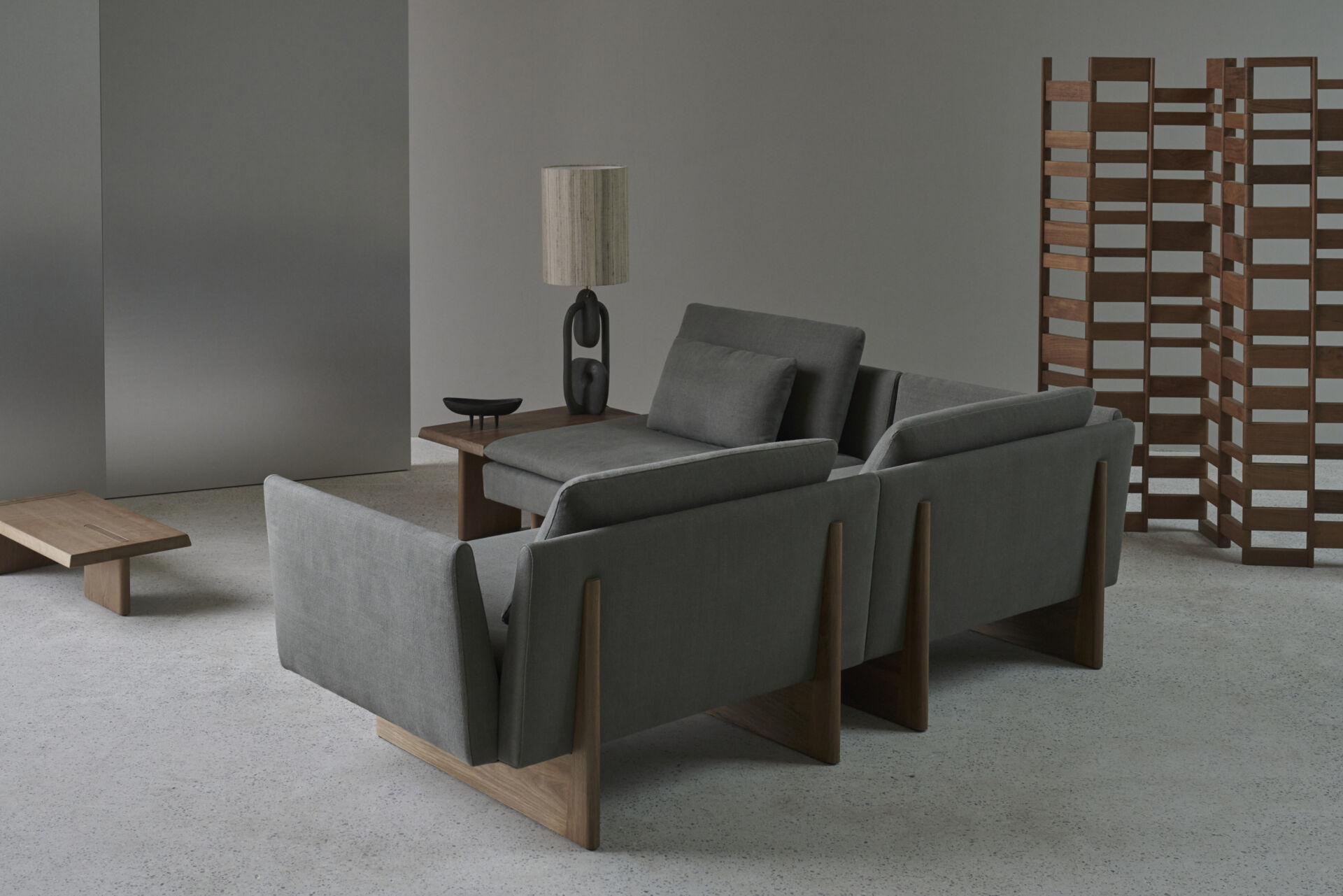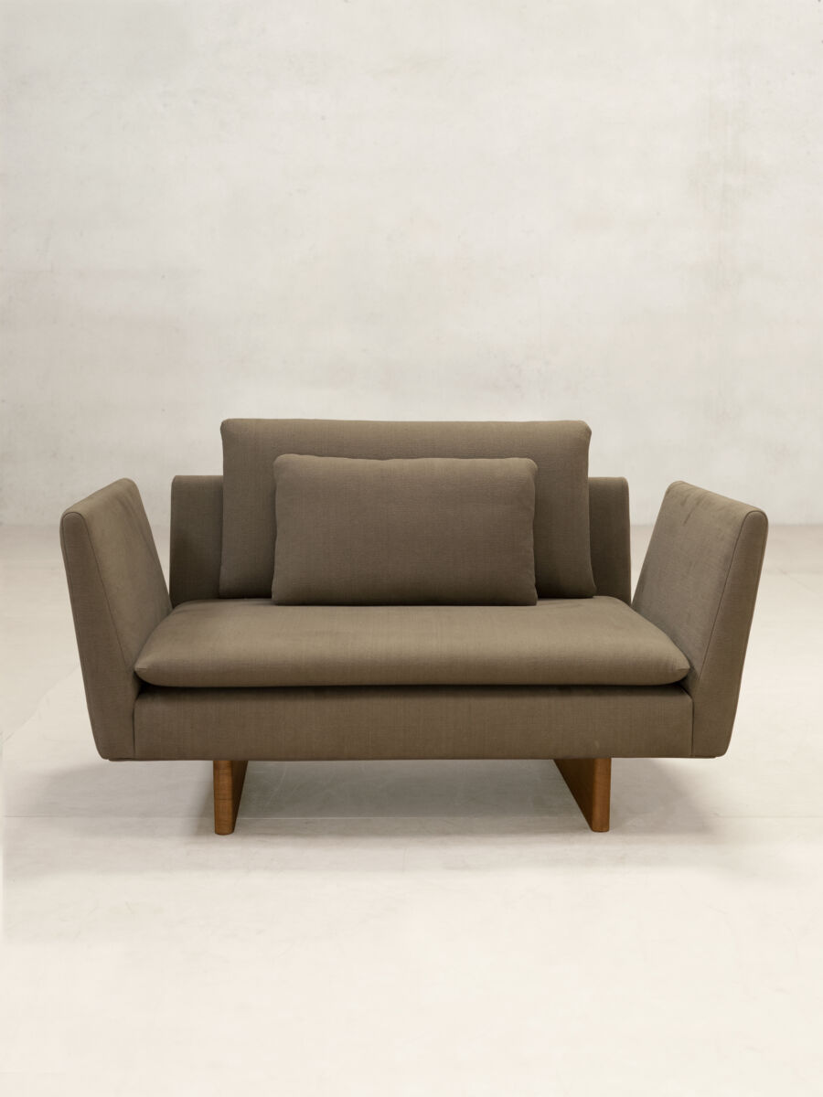 The x+l Modular Sofa/Single Seater is part of the Modular Sofa Set comprising individual upholstered units that are available without arms, with one arm (left or right) and with both arms – that can be used in different combinations to form a single seater, two or three seater sofa. Each unit has a seat cushion and a pair of back cushions. The sofa units are designed to be wide and spacious, with plenty of room for comfortable lounging.